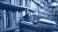 • A striped cat lies atop a pile of books in a well-stocked bookstore, presenting an inviting scene for book lovers and cat enthusiasts alike, suitable for designs related to reading, comfort