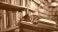 Koty - A striped cat lies atop a pile of books in a well-stocked bookstore, presenting an inviting scene... #737930115