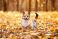 • furry friends cat and corgi dog walking through golden fallen leaves in an autumn sunny park