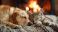 • Golden retriever and tabby cat sleeping together by a cozy fireplace