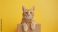 Koty - Orange tabby cat sitting in a cardboard box with yellow background. Adorable pet and playful cat... #838950462