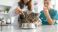 • A cat being fed a balanced diet by a vet technician while a vet discusses nutrition plans with the owner in a cozy, well-equipped practice