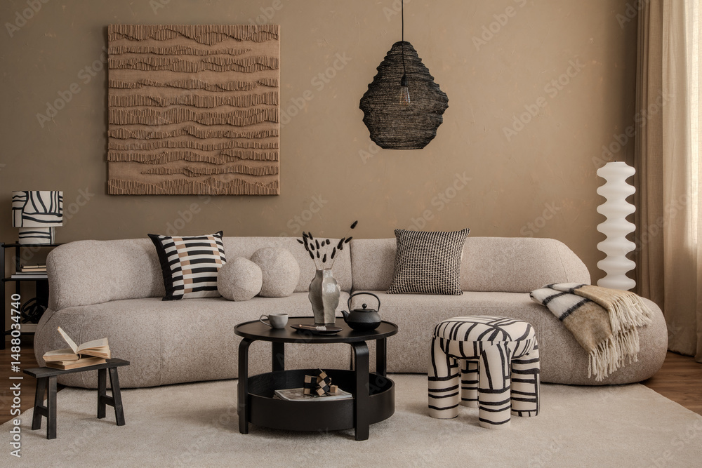 • Contemporary neutral living room with a soft-textured sofa, black round coffee table, abstract wall art, and decorative pillows. Calm earthy color scheme.