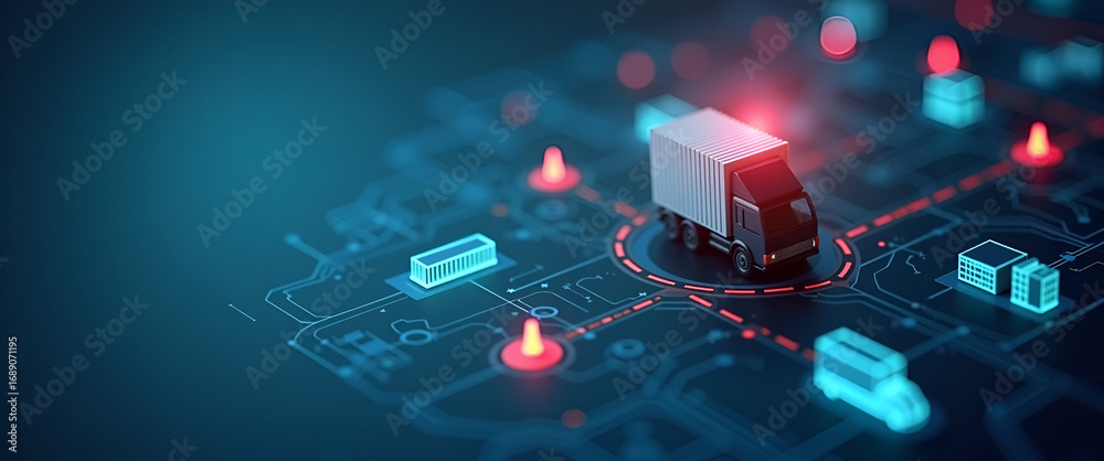 • Close?up of supply chain disruption infographic overlaying port truck warehouse icons with red alert markers indicating breakpoints in logistics chain in Photo Stock Concept and empty space on the