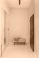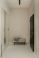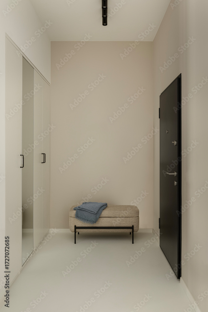 • Minimalist hallway with black door, beige walls, upholstered bench and folded blue throw.