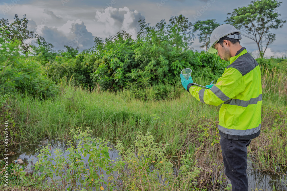Zwierzęta - Environmental engineer wearing safety gear collecting water sample from polluted pond for... #1734572540