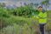 • Environmental engineer wearing safety gear collecting water sample from polluted pond for contamination analysis, environmental testing, and ecological impact assessment in natural outdoor setting.