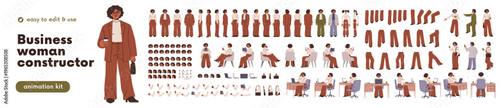 Ludzie - Black business woman constructor, animation kit. Female office worker, body parts, poses at work,... #1965308508