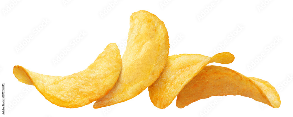 • Delicious crispy potato chips stacked together, isolated on cutout transparent background