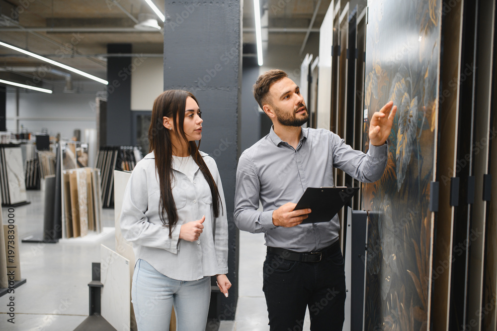 Ludzie - Seller assisting female customer choosing large tiles #1973830000
