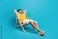• Full length profile side photo of positive guy traveler relax rest beach sun bathing lie comfort deckchair stretch hands wear white shorts isolated over blue color background