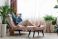 • Happy Caucasian woman relax sit in pink chair in cozy home interior with red cat. Smiling young woman have a rest in armchair, enjoying comfort surrounded by home palm flowers Domestic cat pet.