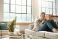 • Woman relax in living room, coffee and peace on sofa, content at home with lifestyle and happiness. Female in apartment, happy woman and coffee cup, positive energy and mindset with wellness