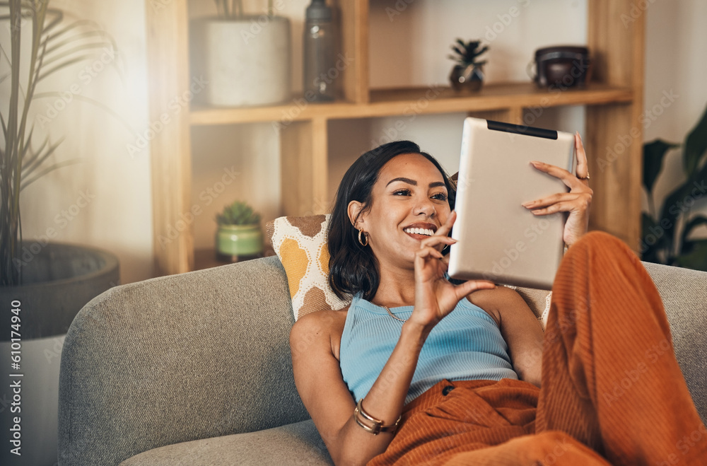 • Woman relax on couch with tablet, online streaming with internet and reading ebook or watching film at home. Happy female person with technology, subscription and mobile app with break in living room
