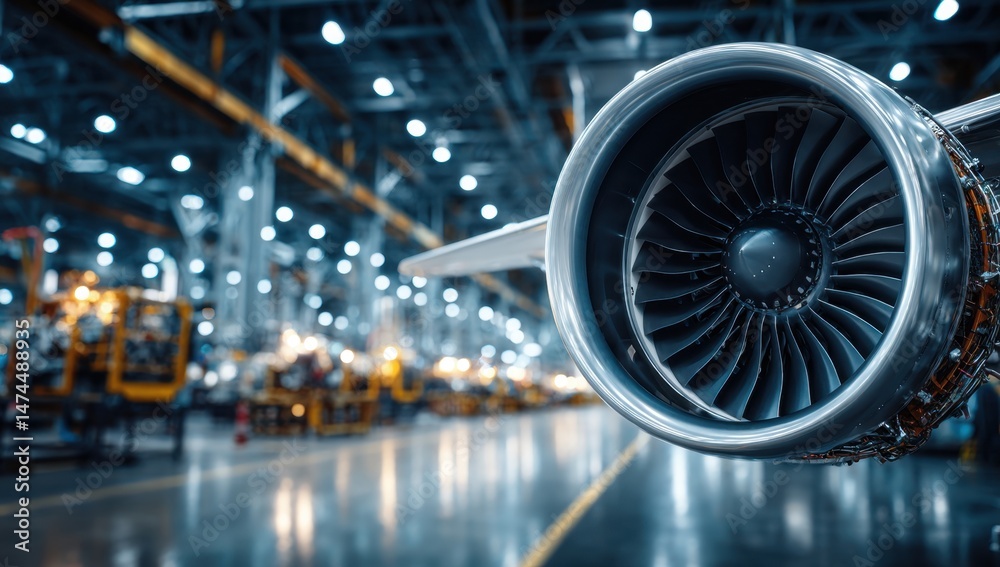 • Airplane engine inside manufacturing factory setting