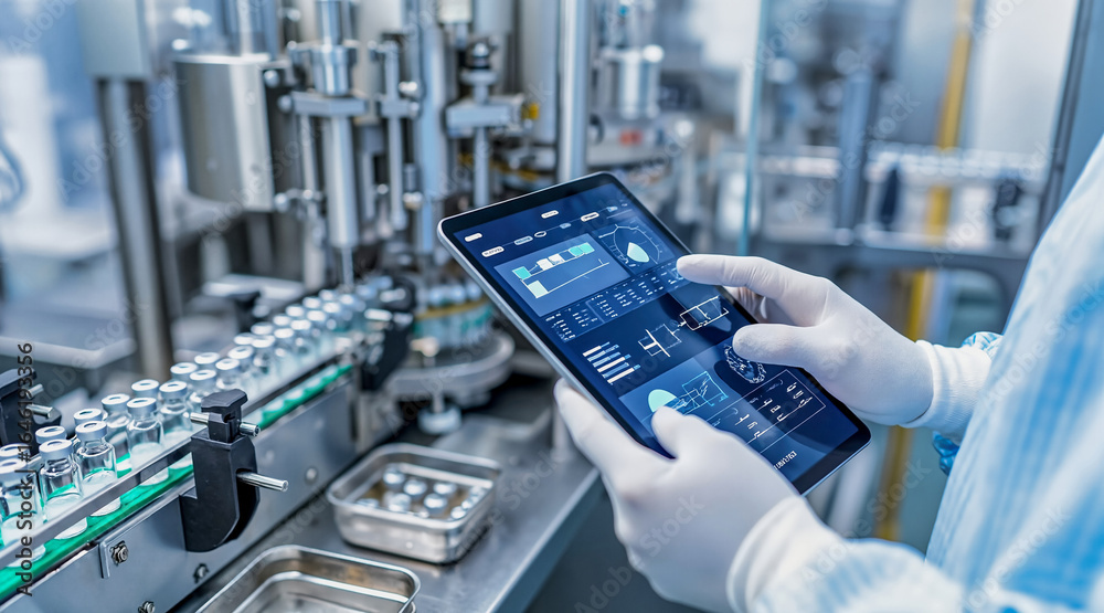 Make up - Pharmaceutical factory worker uses technology to control the vaccine and medicine production... #1646193356