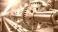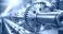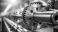 • A worker wearing gloves holds a large, shiny, metal gear on a shaft in a manufacturing environment.