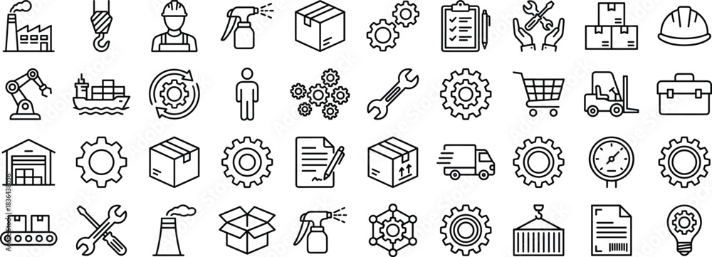 Make up - Industrial logistics line icons set featuring manufacturing factory equipment tools shipping... #1836438056