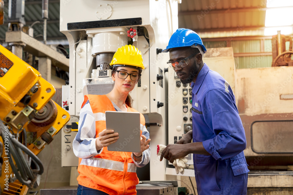 • Supervisor, worker with hard hat working in manufacturing factory on business day. Female industrial engineers have to consult with colleagues while using tablet. Concept of workplace gender equality