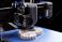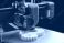 • gantry with x-carriage and print head of a FDM-3D-printer that produces white helical gears on blue print bed. dark surrounding. selective focus. additive manufacturing concept