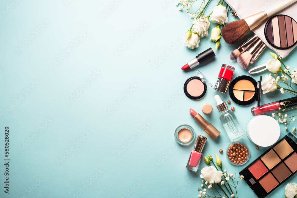 Make up - Cosmetic products on blue background. Cream, powder, shadow, brushes with green leaves and... #560528020