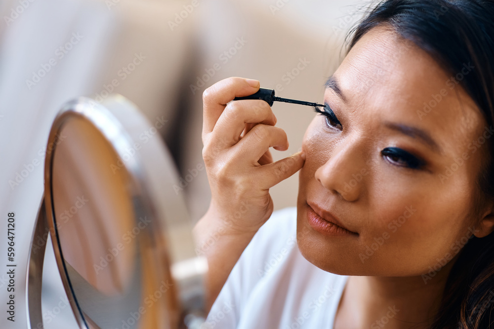 • Asian woman applying eyeliner while looking herself in mirror at home.