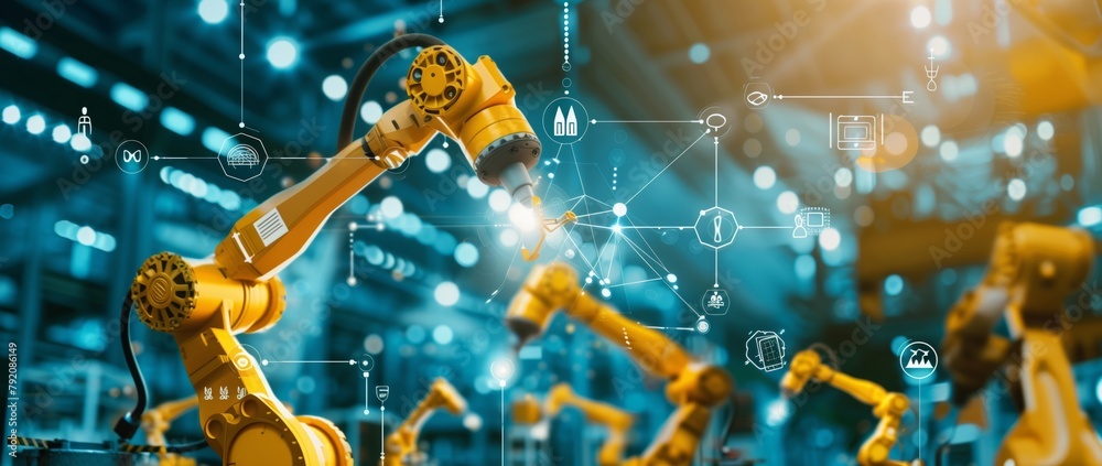 Make up - AI technology in industry, yellow robot arms with manufacturing and design icons, lines show... #792086149