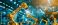• AI technology in industry, yellow robot arms with manufacturing and design icons, lines show information flow, blue industrial background