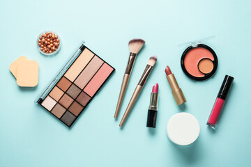 Plakat Make up background with decorative cosmetic products. Beauty industry banner with brushes and shadowsDopasuj i kup