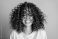 Włosy - Headshot of laughing cheerful girl with curly hairstyle wearing t-shirt white toothy smile... #401937287
