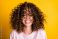 • Headshot of laughing cheerful girl with curly hairstyle wearing t-shirt white toothy smile isolated on bright yellow color background