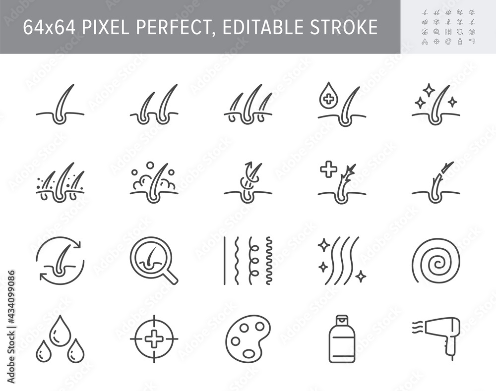 • Hair cosmetic line icons. Vector illustration include icon - skincare, frizzy, repair, revitalizing, scalp, dandruff, follicle outline pictogram for trichology. 64x64 Pixel Perfect, Editable Stroke