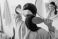 Włosy - back view of young brunette woman brushing hair in bathroom. #574268078