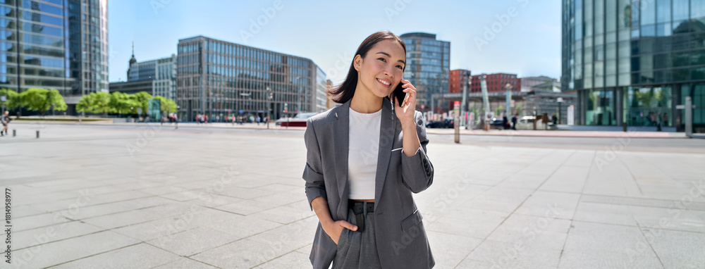 • Young Asian successful businesswoman leader wearing suit standing in big city talking on mobile phone. Smiling woman making business call on cell walking on busy downtown street outdoors