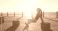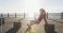 • Doing triceps dips woman wearing red top, shorts, leggings on paved seaside promenade using bollard