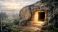 • Empty tomb of Jesus Christ with glowing light inside a stone cave. Resurrection of Christ in morning sunrise with three crosses on background hill. Religious christian easter concept.