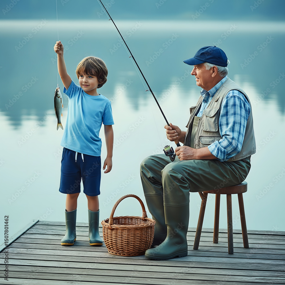 Obrazy Kwiaty - A young male child proudly holds up a caught fish while an older man sits beside him fishing on a... #1507801462