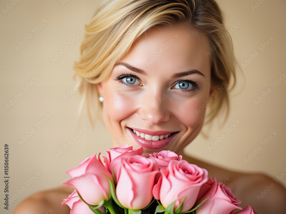 • Uśmiechnięta kobieta trzymająca bukiet różowych róż