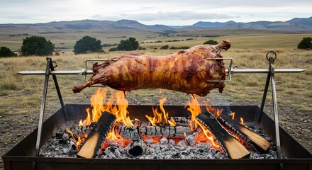 Plakat Creative food concept. Row of golden-brown roasted grilled crispy turkey chicken on rotating rotisserie spits with burning flame fire restaurant background. copy text space. long banner wallpaperDopasuj i kup