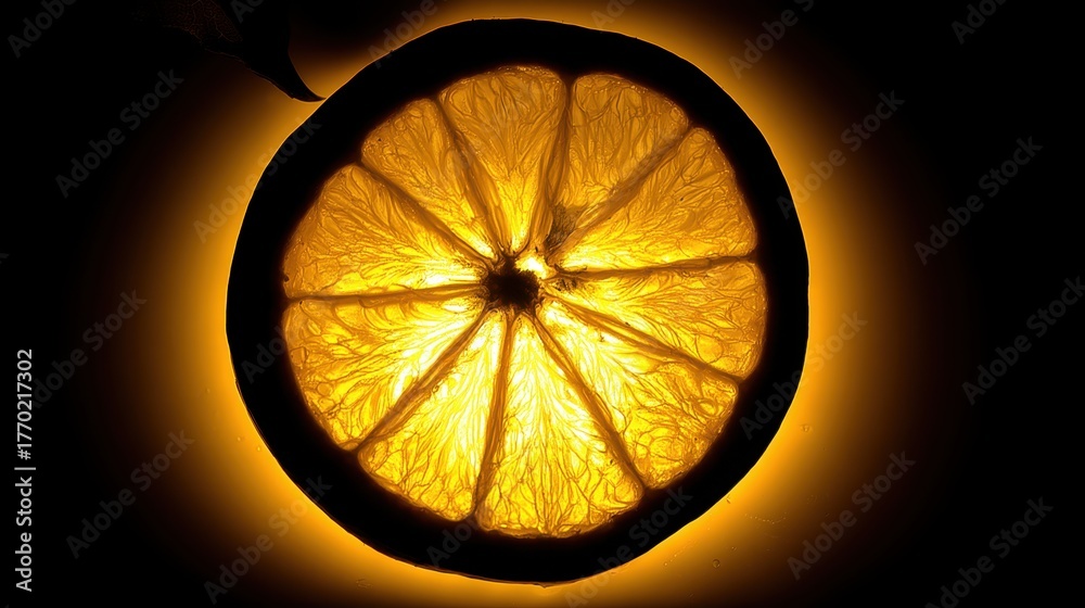 • Artistic lemon slice backlit kitchen food photography dark background close-up bright citrus concept