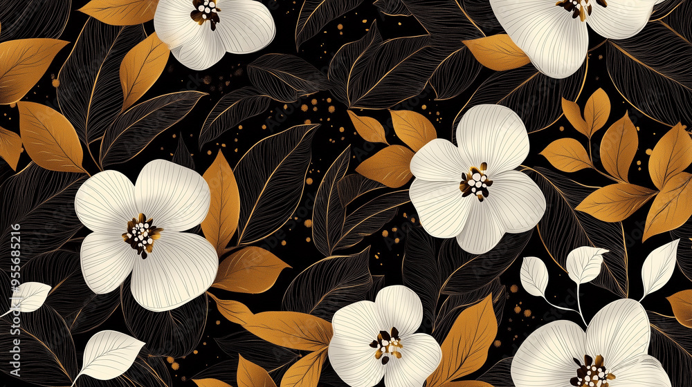 • Abstrakcyjny wzór kwiatowy w odcieniach czerni, złota i bieli na tle. Połączenie tych kolorów tworzy elegancki, nowoczesny wygląd z subtelnym, ale wyraźnym motywem kwiatowym.