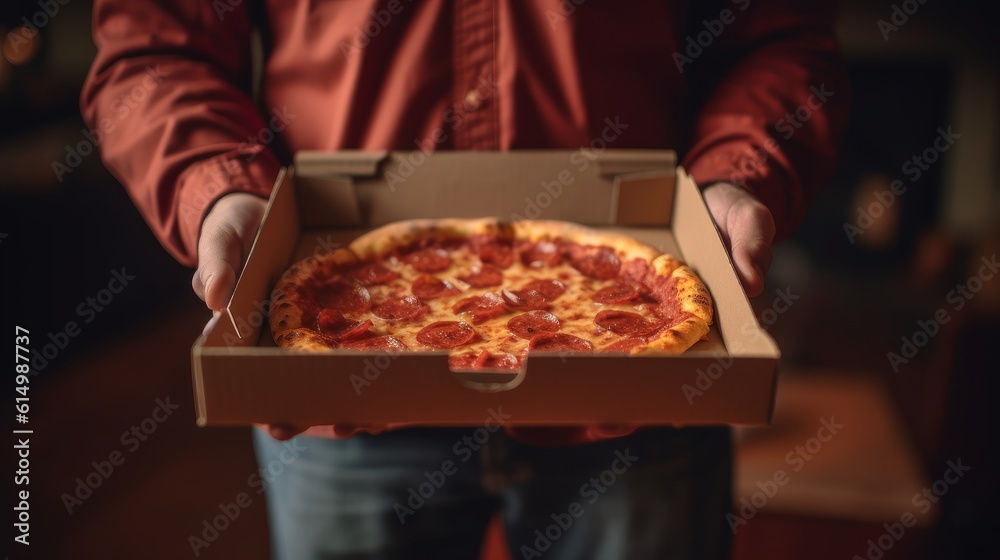 • Hands holding a pizza box. Pizza is ready for delivery. Generative AI