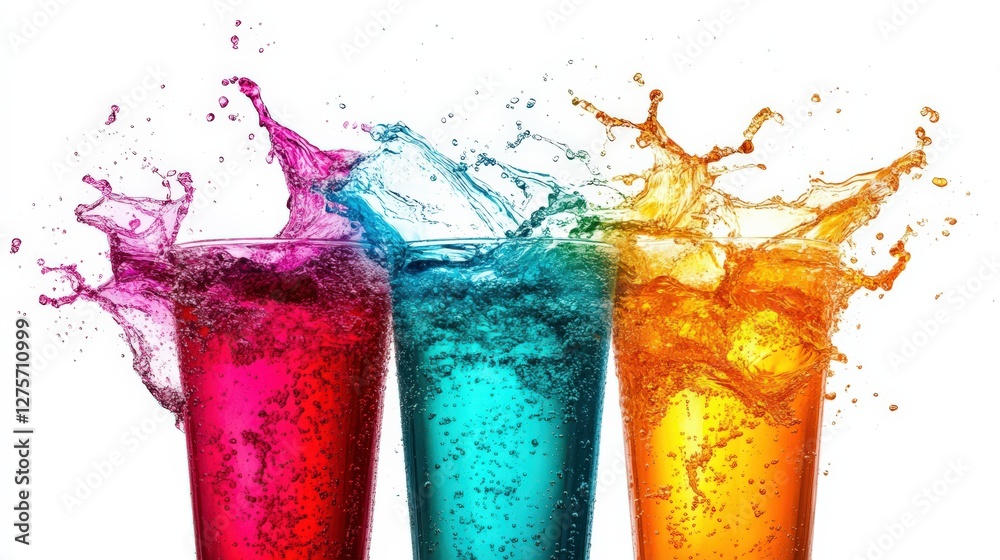 • Three colorful drinks splashing in glasses, showcasing vibrant liquid motion and bubbles