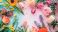 • Płasko leży bukiet kwiatów, tworząc ramkę, składający się z różnych odmian i kolorów. Kwiaty są ułożone w estetyczny sposób.