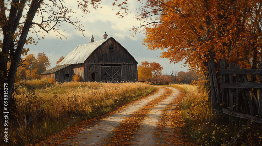 Panel Szklany Pejzaże - Opuszczona stodoła wśród jesiennej scenerii. #1098815275
