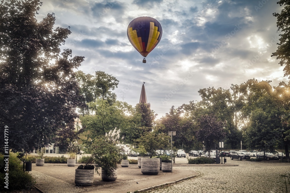 Panel Szklany Pejzaże - balon nad miastem lub wsią leci w powietrzu #1114477719