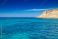 • Morski pejzaż z kamienistą linią brzegową i odległymi górami pod czystym niebieskim niebem, Grecja, greckie wyspy