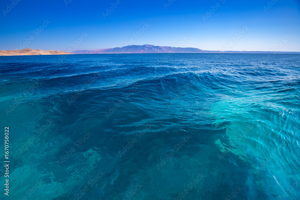 • Morski pejzaż z kamienistą linią brzegową i odległymi górami pod czystym niebieskim niebem, Grecja, greckie wyspy