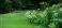 • piękny naturalny ogród z trawnikiem, paprociami i hortensjami, leśny ogród