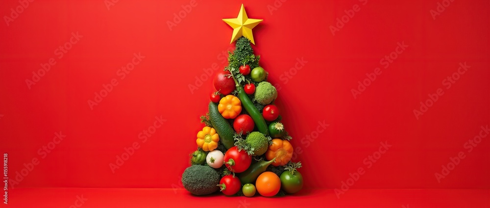 • Christmas tree made of fresh vegetables and fruits on red background.
